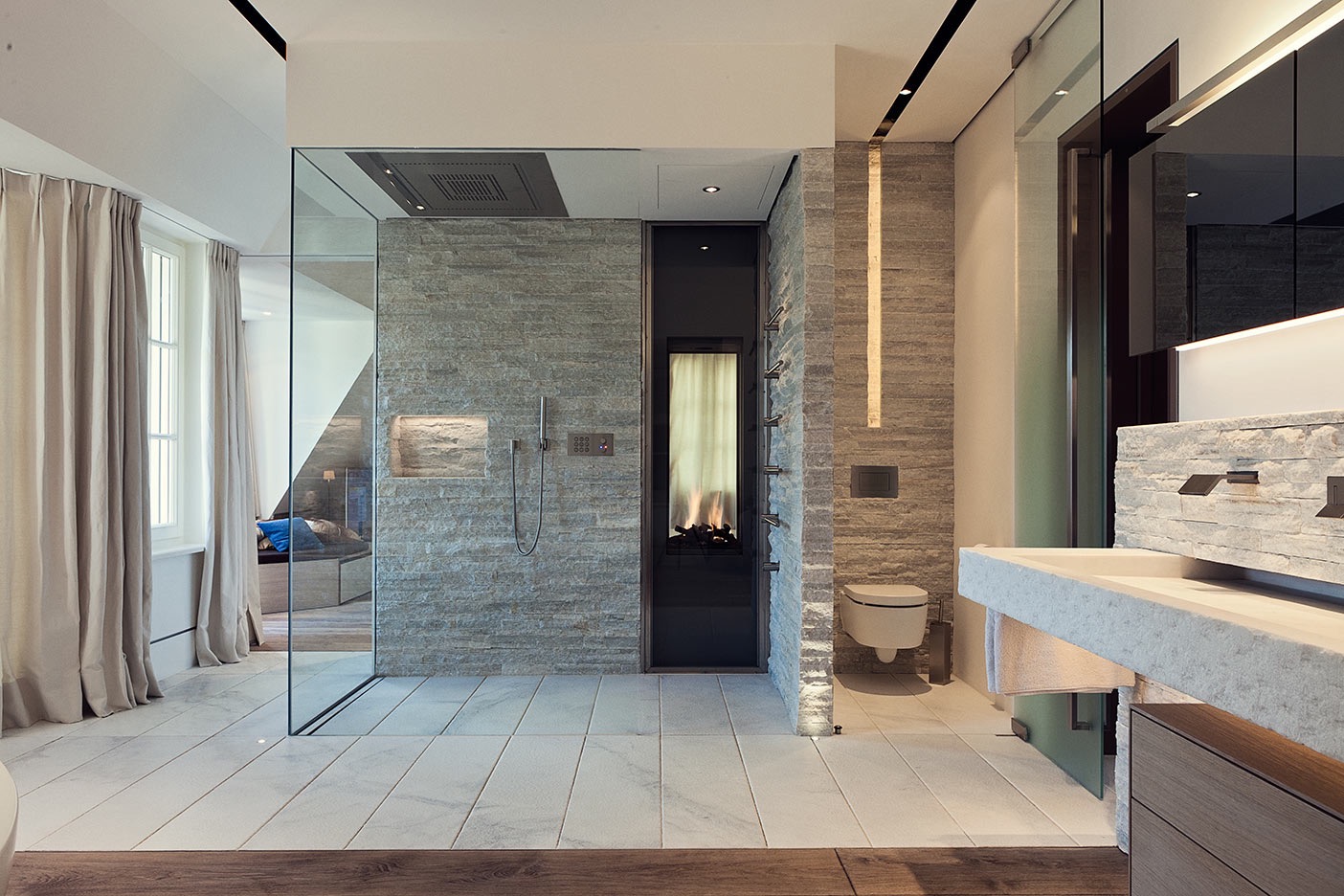 The custom walk-in shower features a custom tunnel fireplace, which can be seen form both bathroom and bedroom.